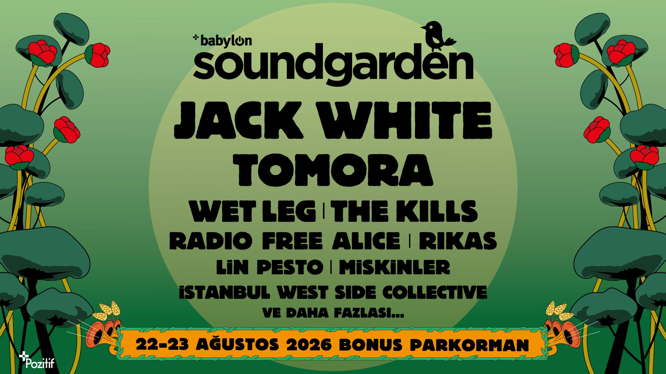 Pozitif Müzik organizasyonu ile gerçekleşecek Babylon Soundgarden 2026, iki gün boyunca farklı sesleri aynı frekansta buluşturuyor. Bu yaz sahnede; Jack White, Tomora, Wet Leg, The Kills, Radio Free Alice, Rikas, Lin Pesto, Miskinler, İstanbul West Side Collective ve daha fazlası seni bekliyor.